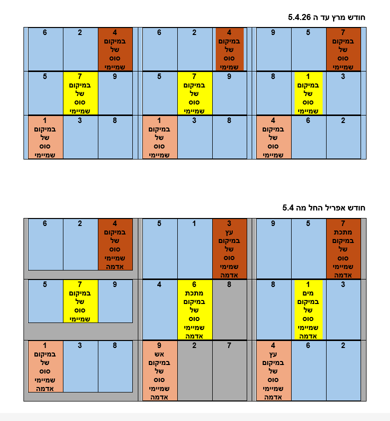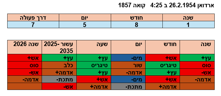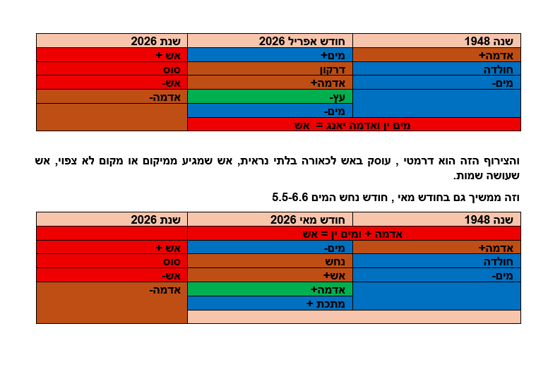הסכנה כפי שציינתי כבר פעמיים, מתגברת החל ב 17.4.26 , ישראל נכנס לחודש ימים עד ה 17.5 למצב בעייתי ומסוכן, מזכיר במידת מה את חודש אוקטובר 2023 יש מצב של הפתעות בהחלט לא חיוביות, הסכנה העיקרית זה שוב הפתעה והפעם יש סיכוי של 47% של מפגש עם נשק לא קונבנציונלי מצידה של איראן. בין אם בפועל או בין אם מדובר בגילוי, וכבר רמזתי על כך בעבר (פקטור כימי ולא ביולוגי) .וזה מתחבר לכך שבציר הזמן מדינת ישראל נמצאת כל השנה במיקום של KUN שעוסק בנדל"ן ( בתים , מגורים, תשתיות) בריאות גוף ונפש, בעלי ברית ומערכות יחסים ו WELL BEING כללי ) בחודש אפריל עד ה 5.5 המצב מועצם, מכיוון שבחודש זה קואה 7 של מדינת ישראל מבקרת במיקום השנתי של קואה 2 (QIAN 6 ) שזה אומר כל הנושא והתחום של דיור, הגנה, מבנים, בתים, נדל"ן בריאות גוף ונפש מועצם, ולא רק זאת, קואה 3 שמציינת את איראן נפגשת עם הקואה 7 של מדינת ישראל. אז גם הנשיא טראמפ וגם ישראל נושקים לאיראן ב במולות ( אופוזיציה ) ו בצמידות.