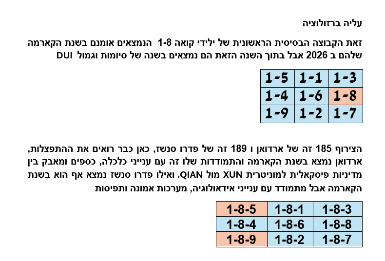 סיכום : יש שלוש שכבות, השכבה הראשונה זה הקואה השנתית 1 שמשותפת לכל ילידי השנתונים הרלבנטיים, השכבה השנייה עוסקת בכל אלה שיש להם את הצירוף 1-8 והשכבה השלישית עוסקת כבר בחלוקה יותר מורכבת בת 3 ספרות, ואז ניתן להבחין שארדואן וסנשז חולקים 2 ספרות משותפות ( 1 ו 8 ). אבל שעולים ברזולוציה , נוצרת דיפרנציאציה, 1-8-5 זה צירוף של ארדואן ו 1-8-9 זה צירוף של סנשז.