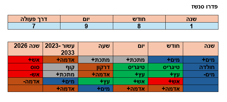 מתוך 9 הסוגים השונים של ילידי קואה 1 הנמצאים בשנת הקארמה, פדרו סנשז נמצא במיקום של השקיעה בתוך שנת הקארמה במצב של חוסר אונים שמתורגם באי יכולת לפעול בתנופה ובעוצמה אלא לקבל את " רוע הגזרה " ומנגד תמיכה ועזרה ממשיכה להגיע אליו מצד תומכים ואינטרסנטים. אבל הסיכויים לחשיפת שחיתות כספית/כלכלית גדולה מתמיד.