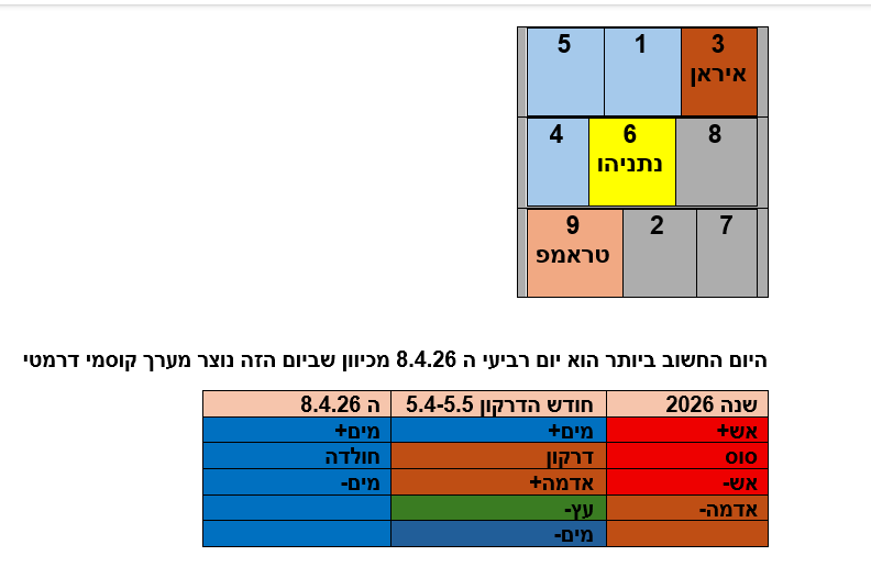 זה מצב של DOUBLE CLASH של גזעים, פעמיים מים יאנג ב CLASH עם אש ין. אבל בענפים נוצרת טרנספורמציה אדמה יאנג בדרקון יוצרת טרנספורמציה של אש עם החולדה. וזה קורה ביום של שבירת שנה. ולא סתם שבירת שנה, אלא שבירת שנה 6, שבירת השנה שסוגרת מעגל. שבירת השנה האוניברסלית לשנת 2026 התרחשה ב 7.2.26 חולדה מים ביום שבת. השבירה השנתית הבאה בתור התרחשה ב 19.2 וכך הלאה והלאה, והשבירה השנתית הקרובה אכן מתרחשת ב 8.4.26 ביום רביעי ושוב בחולדה מים, סגירת מעגל, המשמעות היא , אירוע שמתרחש ב CLASH משמעו שהוא לא מוחלטת ונדרש עוד סיבוב עוד מהלכים להשלמה, וזה יכול לקחת שבועות רבים. ראשית דבר , ילידי קואה 3 6 ו 9 משתייכים כולם לאלמנט האדמה ומיוצגים על ידי הקברים ( קבר במובן של TOMB , מקום קבורה של מלך/קיסר/כהן גדול או כל אדם חשוב , והקבר הזה אוגר את כל המידע התרבותי שקיים, וכולל גם אוצרות ושפע, דוגמא טובה לכך זה הקבר ( TOMB ) של תות אנח אמון או קיברו הסגור ואטום של הקיסר הסיני הראשון ) ילידי שנות הקברים ( ענפי האדמה, שור, דרקון , כבשה, כלב) נמצאים החודש במפגש עם הסוסים השמיימיים ( אנרגיה של חשיבה מאומצת, הפעלת הראש, שינוי טקטיקה או אסטרטגיה, שינוי במערכות אמונה בין אם זמני ובין אם קבוע, ניידות , תנועה במרחב ). כלומר ילידי שנים של דרקון, כבשה, כלב ושור, נמצאים במרכז העניינים בחודש אפריל שזה חודש הדרקון ועל פי הם יישק דבר מכיוון שכעת הם לראשונה מאז שהחלה שנת סוס האש ב 4.2.26,הם באים במגע עם הסתכלות שונה על המצב וכל אחד לשיטתו ומצבו הוא בנוסף הם הכי משפיעים והכי מושפעים בו זמנית. המצב הזה מורכב כי נתניהו נמצא בחודש הדרקון ( אפריל ) בחודש הקארמה שלו מעבר לעובדה שכל השנה הזאת 2026 הוא נמצא מול שליט הקארמה כך שהוא חווה קשיים, מגבלות וצמצום גדולים מהרגיל, הוא מוגבל יותר מאשר במצב רגיל. והכל נעשה יותר כבד יותר מעיק וזה מתבטא בכך שבחודש הארנבת בין ה 5.3 ועד ה 5.4 מדינת ישראל שהתה בחודש הקארמה ומספר ההרוגים שלנו ( אזרחים וחיילים) בארץ ובלבנון גבוה למדי ביחס לחודשים אחרים. לעומת נתניהו ( 6 ) שימצא במהלך חודש הדרקון ( 5.4-5.5 ) בחודש הקארמה הנשיא טראמפ ( 9 ) ימצא בחודש הזה, במיקום שמציין של " הר " שמציין התלבטות קשה, בין שתי אופציות לפחות אם לא יותר לגבי המשך המלחמה ובכלל, עבורו זה חודש של שגעת וטרפת ומהפכים. בהתחשב בעובדה שגם בטכניקת הקיסר הסגול הוא נמצא בעשור ובשנה של LIAN ZHEN HUA JI אזי הוא פועל מתוך טרפת, אימפולסיביות, ומנגד חווה עצירות ועיכובים. ובכל זאת נחוש בטירוף להמשיך הלאה, המצב כל כך דרמטי שטראמפ נתפס בעיני רבים כמטורף. בחודש הזה הוא נפגש עם אנרגיה של עץ ין ( 4 שנתי ) , כאשר יש מפגש בין עץ ואש ( הקואה של טראמפ מיוצגת על ידי אלמנט האש) אזי בודקים איזה מהקואות והאלמנטים המיוחסים להם יותר חזק. אם האש יותר חזקה, אזי היא מיבשת את העץ המשמעות היא בזבוז משאבים. ואכן אלמנט העץ נמצא בשלב 8 בשנת הסוס והמשמעות עבור הנשיא טראמפ זה בזבוז משאבים על חשבון העתיד הקרוב. איראן עצמה מצוינת על ידי הספרה 3 ( עץ יאנג ) ועל ידי ענף הכבשה של , העץ יאנג הוא 1979 אגרסיבי שתלטן וכוחני עם שאיפות התפשטות לכל עבר. בחודש אפריל עד ה 5.5 איראן נמצאת במיקום הכי איטי והכי כבד שקיים , חודש אדמה ין KUN, נמל הבית של קואה 2 וזה המיקום השנתי של 7 מתכת ין. המשמעות טראמפ נמצא מול איראן שזה אומר מאבק , מלחמה, התנגשות ועוד.