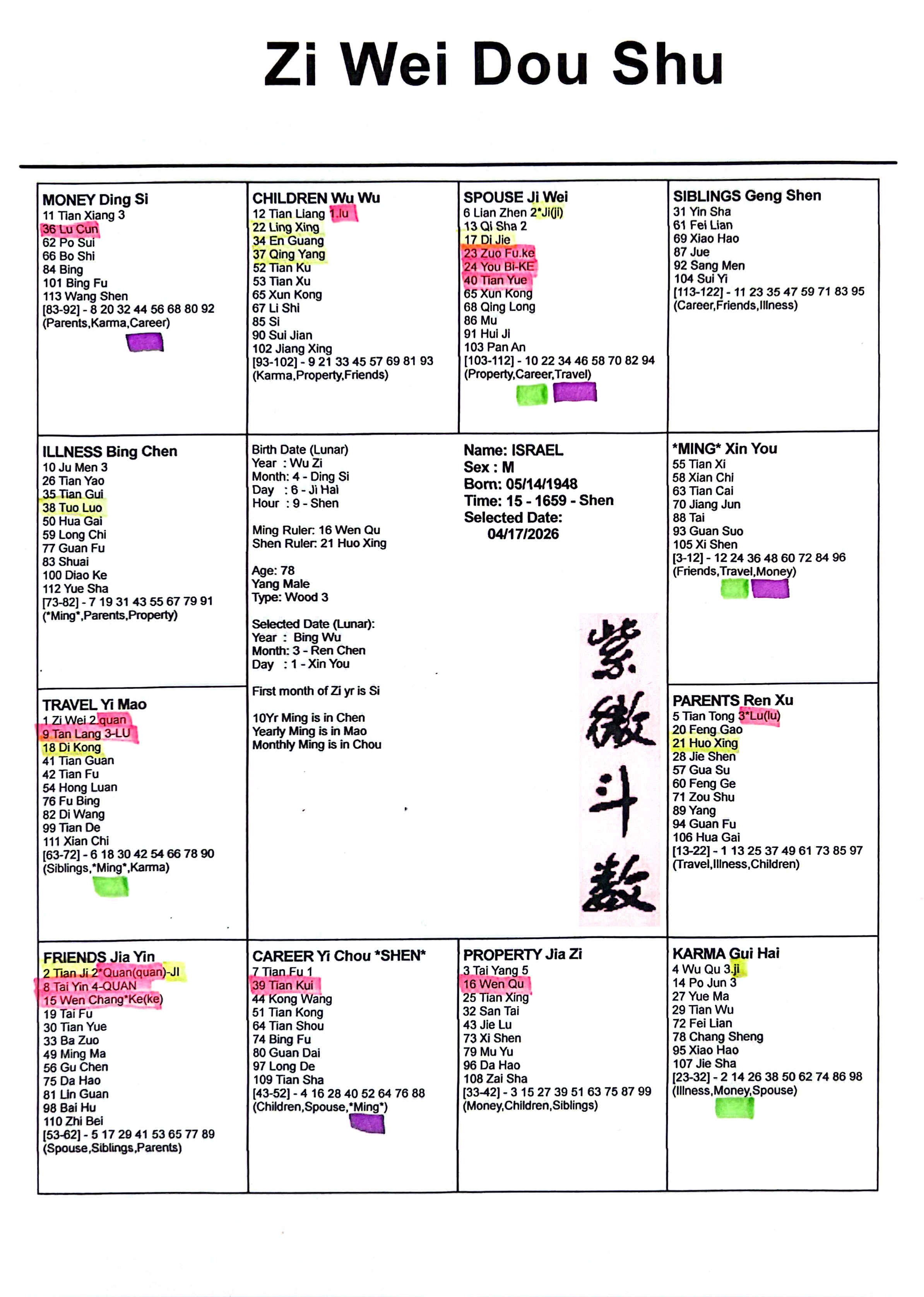 המלחמה תימשך עוד זמן מה, והבעיה הנוצרת ומתהווה עבור ישראל וארצות ההברית, עם סיום המחצית הראשונה של השנה החל מה 15.6.26, מכיוון אז נוצרת תבנית אנרגטית כפי שכבר ציינתי, דומה לזו של שנת 2023 עם התחזקות נוספת של כוכב ההסתרה והאפלה JU MAN 10 וכוכב ה האשליות, והרמייה העצמית TIAN TONG 5 נכנס שוב לפעולה והכל חוזר על עצמו. המשמעות היא שהמחצית הראשונה של השנה למרות שהיא דרמטית יש בה הרבה מזל ועזרה משמיים. מצב דומה אבל הרבה יותר בעייתי מתרחש גם במפתו של דונאלד טראמפ, כפי שציינתי בשני הבלוגים האחרונים ובאחד מהם בסוף השנה הקודמת. במהלך חודש יוני ושוב ב ספטמבר 2026 הנשיא טראמפ ימצא בסכנה רצינית מגורם חיצוני, זה יכול להיות קשור לניסיון של איראנים או כל גורם עוין אחר לפגוע בו, או זה יכול להיות במהלך טיסה וביקור בארץ זרה. ואפשרות נוספת בעיה בכלי דם , לב או משהו דומה, הסיבה לכך נובעת, שבמידה ושעת הלידה שלו היא נכונה, אזי החל מה 29.6.26 הוא נכנס לשנה אישית חדשה מסוכנת , קשה ביותר עם סיכויים קטנים ביותר לשרוד אותה וזה כמובן בהתחשב בכך ששעת הלידה שלו אכן בשעת הנחש. במפה האישית שלו נוצרת תבנית נדירה בשליליותה שיכולה לסמל ניסיון התנקשות בחייו או בעיה רפואית קשה שקשורה לדם, כלי דם, לב, ראש.