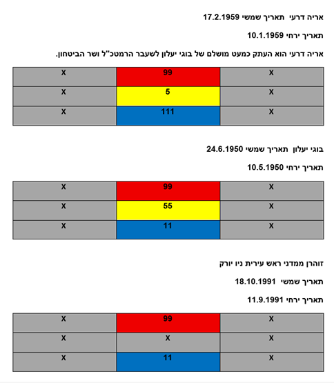 בעוד שלבוגי יעלון ולאריה דרעי יש שורה אמצעית אנכית מלאה שמעידה על נחישות יוצאת דופן, עמוד שדרה חזק ויציב לזוהרן ממדני יש מפה אסטרונומרולוגית מטורפת לחלוטין עם 5 חיצים רעילים. לדרעי ויעלון יש שתי שורות זהות ריקות ( שורה אנכית ימנית שורת הפעולה ושורה אנכית שמאלית שורת ה CONFUSION שמביאה למצב של LEANING ON ONE SIDE) לזוהרן ממדני אין אף שורה מלאה ומנגד יש לו 5 שורות ריקות. נתון שמציב אותו כאדם יוצא דופן, קיצוני נעדר רגש שמונע מתוך שגעת וטרפת, בקיצור אדם מאוד מסוכן. במקרה שלו סופו יהיה גרוע. הוא מורכב ממים ואש בלבד. יש לו 2 קברים ושני ג גנרלים/אפרסקים.