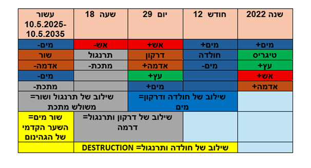 השבעת ממשלת ישראל ה 37 במספר בראשות בנימין נתניהו והליכוד נעשתה בתאריך בעייתי ביותר בלשון המעטה. אלמנט האש ה DAY MASTER בשיא חולשתו בחולדה. במזל יש את אלמנט העץ יאנג בטיגריס שהוא בשלב 4, ואילו האש בשלב 11 בחודש החולדה. המתכת בשלב 8, המים בשלב 5 והעץ בשלב 2. זאת מפה חלשה רגילה, שזקוקה לעוד מאלמנט העץ על מנת להתחזק. אבל זאת לא הבעיה בכלל. העשור של מפת ההשבעה שהחל ב 10.5.2025 הוא של שערי הגיהינום, ולא סתם שער, אלא זה של 1973 ( מלחמת יום הכיפורים ) מעין רפליקה של אותה שנה.