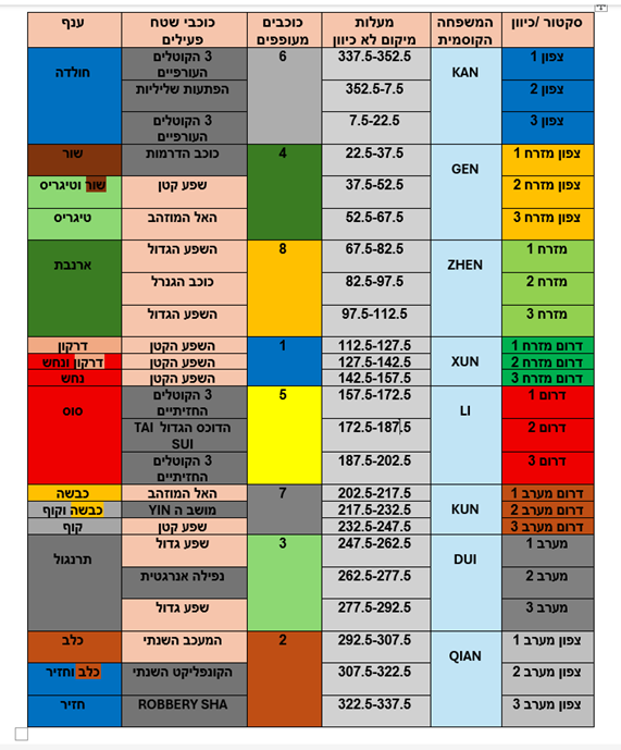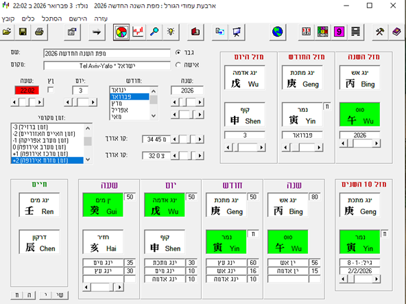 ב 3.2.2026 בשעה 22:02 לפי שעון ישראל מתחילה השנה החדשה שנת סוס אש בישראל. זאת שנה של עודף אש. ראשית יש טרנספורמציה של אש בין גזע היום וגזע השעה. ומשולש אש בין הסוס והטיגריס. יש שלושה סוסים שמיימיים ( טיגריס, קוף , חזיר ) וגנרל /אפרסק אחד ( סוס ) , אין אף ענף אדמה ( שור, דרקון כבשה וכלב ). המפה הזאת נכונה לטווח מאוד מסוים של שעון אוניברסלי, וזאת הייחודיות שלה, שבכל מיני אזורי זמן שונים, ענף השעה שונה, במרוקו למשל , השנה החדשה שנת סוס האש מתחילה ב 3.2.26 בשעה 20:01 עם עמודה של כלב מים. ואילו באיראן השנה הזאת מתחלפת ב 23:32 עם עמודת שעה חולדה עץ. כך שיש גם חשיבות גדולה מאוד למפות האלה מכיוון שהן נותנות תמונה כללית לגבי האנרגטיקה של המדינה הנבדקת בשנה היעודה.