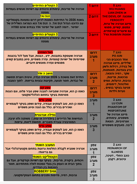 כבר שנים אני מציין ששנת 2026 שנת הסוס אש היא השנה הקובעת לגבי מדינת ישראל. מה שמופיעה במפת מדינת ישראל מתרחש פעם בעשרות שנים. ואני מתכוון לדרמה הענקית שמתבטאת בנוכחות של הכוכב LIAN ZHEN ( מספר סידורי 6 ) שכבר החל מה 2020 חבר אליו הטרנספורמטור השלילי HUA JI (מספר סידורי 48) . וב 2026 חובר אליו עוד HUA JI שנתי ובחודש אפריל גם HUA JI חודשי. הצירוף של HUA JI עם LIAN ZHEN מייצג דם, שפיכות דמים, מוות, הונאה, בגידה, שקר, כוח משחית, פנטיות, נטייה להקצנות, מיניות מופקרת. אפשר להשוות את האנרגיה של LIAN ZHEN לזאת של פלוטו . מפת מדינת ישראל משתנה בצורה דרמטית החל מה 20.2.26 , אז מתווסף HUA JI 48 לתבנית הראשית של מדינת ישראל בארמון של MAO YI ( שזה ארמון ה TRAVEL הקבוע של מדינת ישראל ) וארמון ה MING ( הגורל) הראשי של מדינת ישראל החל מאמצע יוני 2026 ועד סוף יוני 2026, השוני זה בכמות האנרגיה השלילית שמתווספת למפת המדינה. במצב הזה נוצר פורמט המוכר בשם "JI JU MAO YOU" זה פורמט כלכלי מאוד טוב , שמביא שפע עצום, הצלחה כלכלית בתחומים שקשורים באלמנט המתכת ( תעשייה כבדה, כלי נשק, תחמושת, היי טק בתחום של סייבר ועוד ) אבל הנוכחות של כפולה של HUA JI בארמון הקריירה השנתי של מפת מדינת ישראל מראה את ההיפך. ושוב אני חוזר על 3 התסריטים האפשריים בשנת 2026