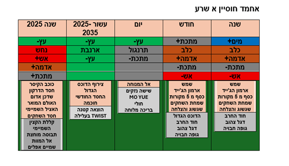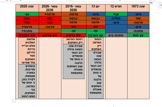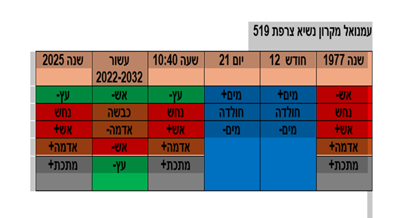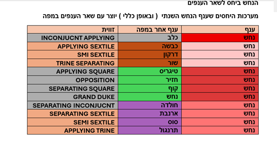 הענפים נחש , סוס וכבשה מציינים את אלמנט האש בשלבים 4, 5 ו 6. האש מייצגת אופטימיות, תקווה, אמון, התלהבות , ומשפיע על בורסות העולם , מכיוון שהיא סוחפת, מלהיבה, והאש מוגדרת במטפיזיקה הסינית כ " הקוסם " מכיוון שהיא מייצרת אשליה שמתבטאת בתעשייה שלמה של קולנוע, טלוויזיה, אופנה, קוסמטיקה וגם רוחניות מכיוון שהמילה הארה מגלמת בתוכה את אלמנט האש ( אור, תאורה , נראות, זרקור ) , אבל כל אדם וכל ישות שיש לו תאריך לידה, רצוי שיהיה מודע אם האלמנט הזה של האש טוב לו, לא לכולם האש רצויה בשנה או בעשור או במיקום מסוים. האש של שנת הנחש 2025 היא אש לא יציבה, היא אומנם בשלב 4 שהוא שלב חיובי ( יש 12 שלבי התפתחות לכל אלמנט ). האש נולדת באביב בחודש הטיגריס, מגיע לשיא בקיץ, דועכת בסתיו וחלשה ביותר בחורף. שנות הנחש פחות טובות למדינת ישראל ולארצות הברית בגלל שהאלמנט הזה של אש לא נחוץ וגם בגלל מערכת היחסים שענף הנחש יוצר עם ענפים אחרים במפה. אבל בו זמנית אלה הן שנים של מפנה חשוב , דרמטי ויצרני במובן של קביעת חוקים, רגולציות ותהליכי קבלת החלטות בשונה ממה נהוג עד כה, בגלל שהנחש מסמל טרנספורמציה ( השלת העור ),לגבי ארצות הברית זה מסמל שינויים משמעותיים ברמה הביטחונית, צבאית וכלכלית. לדוגמא שנת 1929 ( נחש אדמה ) נפילת הבורסה בארה"ב ובעקבותיה השפל הגדול, 1941 ( נחש מתכת ) היפנים תוקפים את פרל הרבור וארה"ב מצטרפת למלחמה לצד בעלות הברית, 1953 ( נחש מים ) מלחמת קוריאה מגיע לסיומה עם 36,000 פלוס הרוגים אמריקאים ועוד 8000 פלוס נעדרים ושבויים, ועשרות אלפי פצועים. 1965 שנת ( נחש עץ ) הייתה השיא של מלחמת וייטנאם, במה שמוכר " מבצע רעם מתגלגל " לאחר מכן ב 1977 ( נחש אש ) מתקפת הטרור של התנועה החנפית בוושינגטון, פיגוע הטרור המוסלמי הראשון בארצות הברית שנעשה על ידי אמריקאי שהתאסלם, ב 1989 שנת (נחש אדמה) ארצות הברית פלשה לפנמה, הסיבה לכך שבשנת 2000 הייתה אמורה לפוג השליטה של ארצות הברית בתעלה. הסיפור מורכב יותר מכיוון שהדיקטטור הפנמי , מנואל נורייגה היה סוכן לא רשמי של ה CIA וקיבל כסף עבור שירותיו. בשנת 2001 שנת ( נחש מתכת ) התרחש פיגוע הטרור הגדול בעולם, ב 11.9 עם 3000 נרצחים. בשנת 2013 שנת ( נחש המים ) היו מספר פיגועים בארצות הברית, הפיגוע במרוץ בוסטון, הפיצוץ במפעל הדשנים בטקסס עם 15 הרוגים ( לא ברור עם פיגוע או טעות אנוש ), הטבח בבסיס הצי האמריקאי עם עשרה הרוגים, הרצח בנמל התעופה של לוס אנג'לס, וכעת אנחנו שוב בשנת הנחש ( נחש עץ ) שהחלה ב 4.2.25 . לגבי ישראל שנות אלמנט האש, שנת הנחש שנת 2025 הסוס 2026 ושנת הכבשה 2027 , מקבילות פחות או יותר לתקופת האינתיפאדה השנייה בשנים 2001-2003 , לראש הממשלה דאז אריאל שרון, למשטרה ,לשירות הביטחון ולצבא לקח כ 3 שנים לנצח במערכה הזאת, כנ"ל גם כעת, ההבדל הוא שהממשלה של אז הייתה אמינה ומקובלת על כל הציבור, הציבור שם מבטחו באריאל שרון וממשלתו ביודעו שהוא יכול לישון בשקט בלילה כי אריאל שרון העניק תחושה של מנהיג של כולם, של כל העם. אלמנט האש בשנה הבאה 2026 הוא דרמטי כי מדובר בסוס אש, הסוס השני במניין חמשת הסוסים, מדובר בשנה שהיא כולה אש, גם הגזע וגם הענף הם אש. אלמנט גרוע מאוד למדינת ישראל, 60 שנים קודם לכן, בשנת שנת 1966 (סוס האש), ישראל נקלעה למיתון כבד בעקבות גירעון במאזן התשלומים, עליות שכר במגזר הציבורי, עלייה בתקציב הביטחון, אבטלה גדולה, אינפלציה. הייתה זאת תקופת שפל גדולה מאוד שכונתה המיתון הגדול והביאה לגל הגירה גדול מאוד, לארצות הברית ואחרי מלחמת יום הכיפורים לארצות הברית, דרום אפריקה, אוסטרליה וגם למערב אירופה. הירידה הייתה כל כך דרמטית שיצחק רבין כינה את היורדים כנפולת של נמושות. התהליך הזה ימשך ביתר שאת בשנים הבאות, אבל כדי לא ליצור דימוי שלילי כולם מכנים את התופעה כרילוקיישן ( שינוי מיקום ) לכמה שנים. וזה חוזר בשנה הבאה החל מחודש יולי 2026 וחודש אוגוסט 2026 מצטייר כחודש דרמטי. שנת 2025 היא גם שנה של אש, היא פותחת את עונת האש ( השנים , 2025, 2026, 2027 ) והחודשים מאי יוני ויולי כל שנה הם החודשים ה "ח