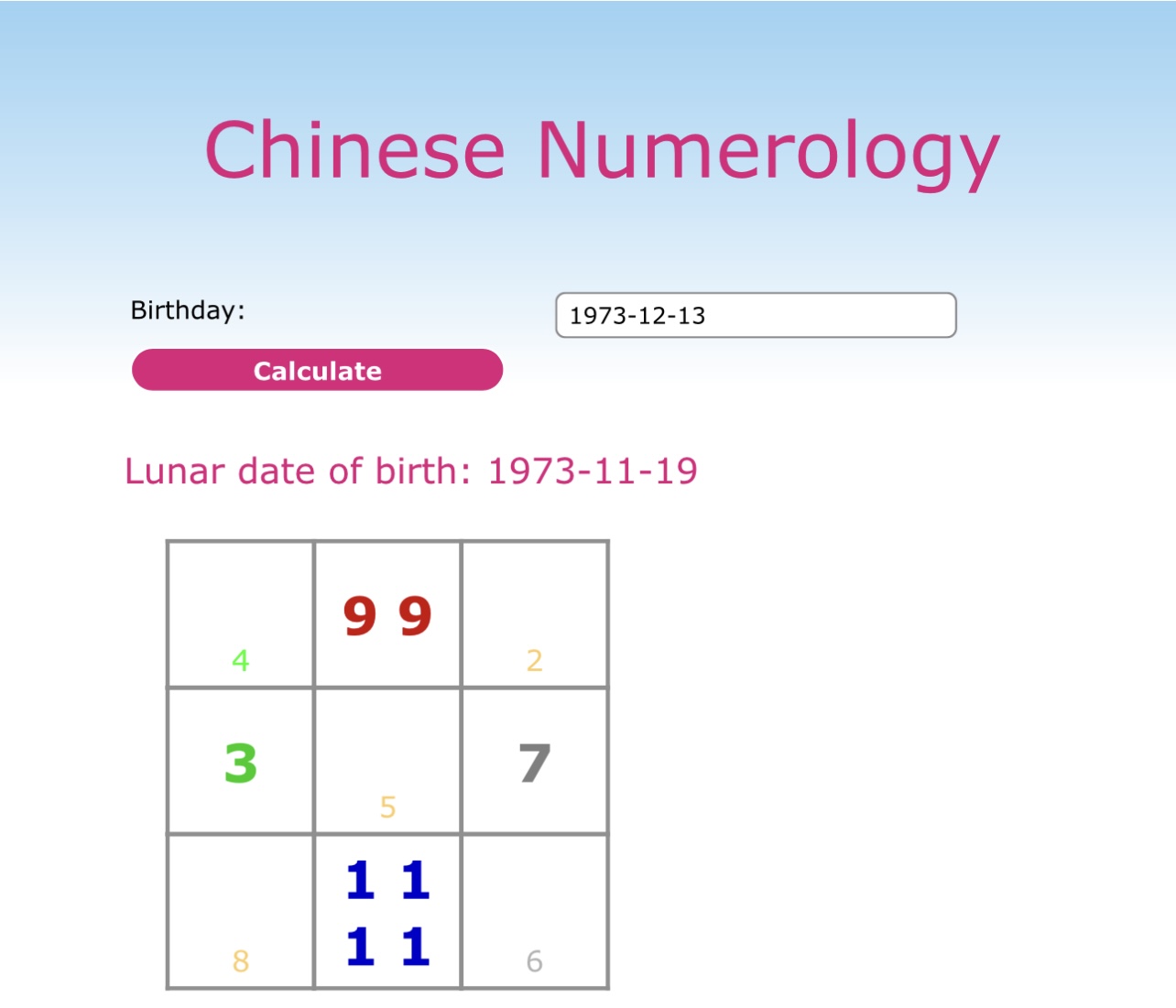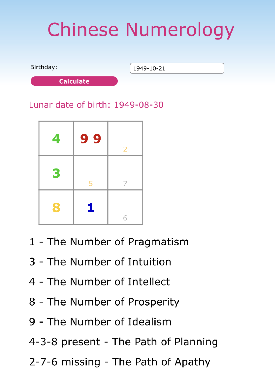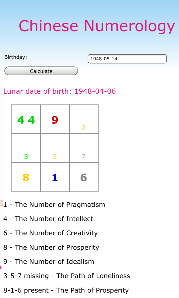 מפת האסטרונומרולוגיה הירחית המולדת שלו מגלה שיש לו שני חיצים רעילים במפה הירחית, ( חץ רעיל זה מצב שבו שלוש משבצות שיוצרות שורה אופקית או אנכית או אלכסונית, הן ריקות ). את הספרות החסרות ניתן לראות במשבצות הריקות, חסרה לו השורה האלכסונית של 8 5 2 שמכונה במטפיזיקה הסינית כ " גלולות מרות לבליעה" או כחץ התסכול, והחץ הרעיל השני זה היעדר האלכסון השני של הספרות 6 5 4. שמוכר כחץ ההצמדות והאחיזה, מצב המייצג גישה צינית לחיים נטייה לחשדנות, לא מקבלים אחריות למעשיהם, ובמקביל מגלים עניין מסוים בדת ומיסטיקה. ועליהם נאמר על פי המטפיזיקה הסינית שהנשמה שלהם חיה בצל. לעומת זאת יש לו 4 מופעים של הספרה 1 שמייצגת רהיטות וצחות דיבור, פרגמטיות, אגוצנטריות, סודיות וחשאיות.