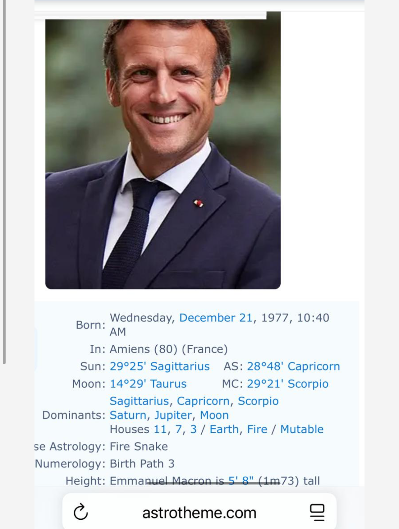 הנשיא עמנואל מקרון הוא מים יאנג בגזע היום DAY MASTER, בת הזוג הלגיטימית ( רעיה) שלו מיוצגת על ידי אש ין. והנה הפלא ופלא, האש ין מופיעה בגזע של עמודת השנה, המשמעות היא קשר רומנטי עם בת זוג מבוגרת מאוד. לעומתו בריג'יט מקרון היא יאנג עץ ב DAY MASTER, בן הזוג/בעל עבורה מיוצג על ידי מתכת ין. ושוב עוד הפלא ופלא, הין מתכת מופיעה בגזע השעה. המשמעות בן זוג צעיר מאוד. עמודת היום מעבר להיותה השתקפות של היום יום, היא גם מייצגת את הילדים של בת הזוג. ולא רק , גם פיקודים וחניכים. אז איפה הבעיה. התשובה טמונה בציר הזמן, בעשורי המזל. היא נמצאת בעשור של חזיר מים ( החל מ 2020 ) שיוצר CLASH לנחש בעמודת היום, ובשנת 2025 היא נמצאת בשנת הקארמה. בניגוד גברת הראשונה של צרפת, שיש לה מפה חלשה רגילה שמכילה את כל האיכויות ( סוס שמיימי , קבר, אפרסק ) ואת כל עשרת האלים למעט משאבים הרמוניים. לנשיא מקרון יש מפה מוזרה, יוצאת דופן, לא מאוזנת בעליל, עם עצמי/מקבילים מרובים מדי, עודף מים ( אלמנט הסתרה, מניפולטיביות, תחכום , תושייה מרובה ( חולדה ). אין לו ענף אדמה ( קבר ) יש לו שני אפרסקים/גנרלים ושני סוסים שמיימיים. אפשר לומר שהמפה שלו מורכבת משני אלמנטים מים ואש. זאת מפה שאין בה ערכים, אין בה הגינות, אין בה יושרה, אלא אהבה לכוח, עוצמה ושליטה בלבד. בשנת 2022 הוא נכנס לעשור של כבשה אש, מצד אחד נראה שאלמנט האדמה של הכבשה האדמה טוב לו כי היא מחזקת את פרמטר הכוח שלו, מנגד הכבשה עושה זווית של HARM מול שתי חולדות בחודש וביום הלידה. זאת מערכת יחסים בעייתית עד הרסנית, כוחות שונים בממשל ובפוליטיקה הארצית וגם העולמית חותרים כנגד סמכותו. שנת 2024 הייתה אחת השנים הכי דרמטיות בפוליטיקה בצרפת, במהלך השנה הזאת התחלפו 4 ממשלות, והנשיא מקרון קיים גם בחירת בזק לאסיפה הלאומית וזאת לאחר התבוסה שחווה בפרלמנט האירופאי. מאז 2023 צרפת חווה חוב לאומי של 112% ביחס לתמ"ג, חוב שגבוה ב 30% מהממוצע האירופאי. למקרון אגו ענק ותיאבון עצום לפרסום כוח ובעיקר כבוד, הראייה לכך זה מספר אותות הכבוד והעיטורים שהוא קיבל, 33 במספר , לעומת 29 ששארל דה גול קיבל. הקצב מדמשק בשאר אסד קיבל 29 אותות ועיטורים. אנגלה מרקל נשיאת גרמניה לשעבר קיבלה כ 55 אותות ועיטורים. דגול ומרקל ראויים, מקרון ואסאד בהחלט לא ראויים.