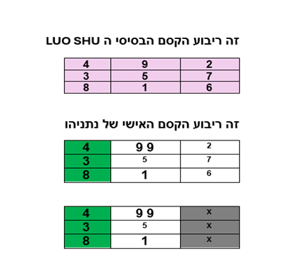 לביבי יש שורה אחת מלאה , השורה השמאלית האנכית עם הספרות 8 4 3 שמכונה שורת התכנון והאסטרטגיה , וגם שורת החזון ושורה אחת ריקה עם הספרות 6 7 2 , המוכרת בשם שורת האפטיה , מצב בו 3 הספרות של השורה האנכית ימנית חסרות לביבי נתניהו יש שורה אחת מלאה, השורה השמאלית האנכית ( 8 3 4 ) השורה של החזון VISION, הראייה קדימה, האסטרטגיה. שורת התכנון והיצירה. השורה הזאת מכונה " שורת הפוליטיקאים " אבל מאחר והיא מאופיינת בעודף עץ, אזי זה יכול להתבטא באיבוד גבולות, וחוסר אתיקה. לעומת זאת השורה האנכית הימנית זאת של ( 6 7 2 ) מוכרת כחץ האדישות שיכול להתבטא בצורות שונות. יש כאלה שאצלם זה בא לידי ביטוי כאפטיות וחוסר אנרגיה ברמה הפיסית. ואחרים זה מתבטא באדישות לגורלם של אנשים אחרים.