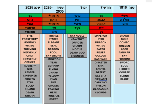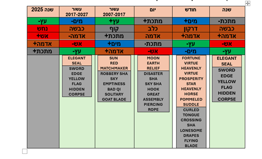 REVERSE ENGINEERING של מפת הפצ"רית לשעבר, מגלה שיתכן שהיא נולדה בשעת הדרקון 07:00-9:00, כי מתוך 12 המפות האפשריות המפה הזאת מגלה שהשנה היא נכנסה לעשור של HUA JI 4 TAI YANG. והשנה ארמון ה TRAVEL שמציין את האנרגיה שהאדם פוגש בתחום העבודה, חברה, קריירה ונסיעות מכיל צירופים קשים, עם כי יש לא מעט נקודות אור עבורה. אנשים חזקים מאוד ובעלי השפעה באים לקראתה. ולא רק זאת בחודש החזיר החל מה 8.11.25 מצבה הנפשי מתערער, מכיוון שהכוכב LIAN ZHEN כוכב 6 מקבל HUA JI 48 . ביחד עם DI JIE 17 כוכב הריק ועם QING YANG כוכב שפועל כמו איל מלחמה. מנגח ומנגח את בעל המפה עד בלי די ודווקא בארבעת המזלות של הגנרלים/אפרסקים הוא בשיא כוחו ועוצמתו..