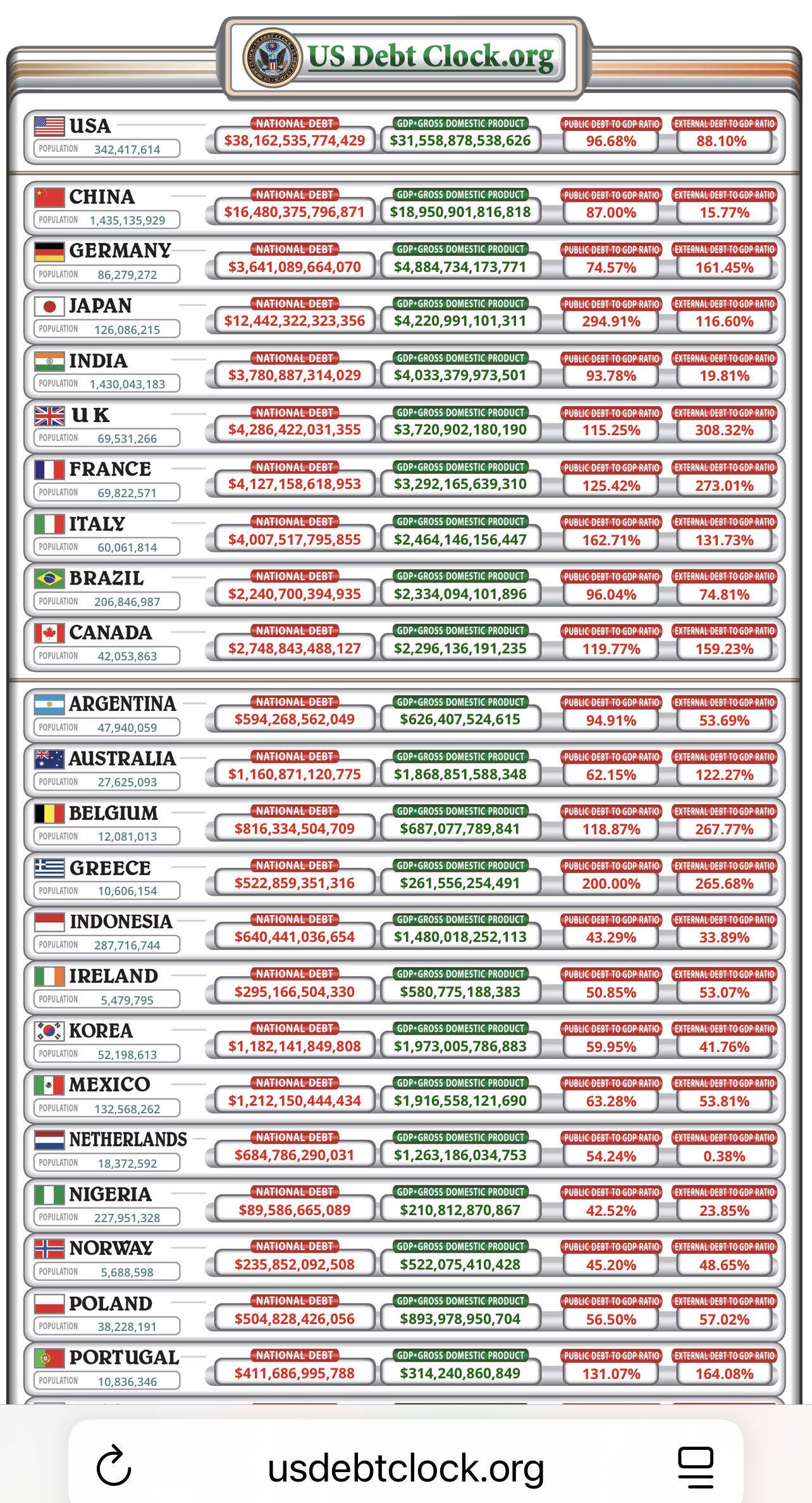 צילום מסך מתוך האתר USDEBTCLOCK.ORG החוב העולמי והדולר , עליית מחיר הזהב = מלחמה , זאת כבר הפעם השישית או השביעית שאני מזכיר את החוב העולמי כסכנה גלובלית גדולה יותר ממלחמה עולמית. אני מצרף צילום מסך עכשווי של שעון החוב העולמי. הנתון החיובי בו, זה היקפה של הכלכלה האמריקאית. החל מ 2020 כלכלנים ברחבי העולם טעו לגבי, מי הוא בעל ההגמוניה הכלכלית בעולם. גדולי הכלכלנים בעולם טענו אז שעד 2025 הכלכלה הסינית תהיה דומה בהיקפה ונפחה לכלכלה האמריקאית ובשנת 2028-29 היא תעבור את הכלכלה האמריקאית בנפחה, לא רק שזה לא קרה, ההיפך מכך התרחש. לא רק שהפער צומצם , אלא הוא התרחב בצורה דרמטית לטובת ארצות הברית. וזאת הסיבה שהנשיא טראמפ מצליח עד עתה לכופף את כל העולם לצרכיו ורצונותיו. נכון לאוקטובר 2025, התוצר לאומי מקומי AKA תל"ג נאמד ב 31.5 טריליון דולר. בעוד שהתל"ג הסיני מגיע ל 18.95 טריליון. יתרה מכך הכלכלה האמריקנית כמעט משתווה לסך הכלכלות של סין, גרמניה, יפן והודו ביחד, 330 מיליון אמריקאים חזקים יותר כלכלית מ 2.94 מיליארד תושבים של 4 המדינות ( סין, הודו, יפן, גרמניה ) . אבל בו זמנית החוב הלאומי/ציבורי של אמריקה מגיע ל 38.1 טריליון דולר. ושווה לסך כל החובות הלאומיים/ציבוריים של סין, גרמניה, יפן הודו, בריטניה וחצי מהחוב של צרפת. כך שהמצב מורכב למדי וארצות הברית עושה כל מה שביכולתה על מנת לשמר את הדולר כמטבע החשוב בעולם. אבל רק מורטוריום בדומה לחוקים של חדלות פירעון יפתור את הבעיה הזאת מבחינה עולמית. החוב העולמי כולו הוא פי 3 מהתוצר הלאומי המקומי העולמי. בשנה הבאה המצב מגיע לשיא ורק מלחמה כל בכל תפתור את זה ולכן יש מרוץ התחמשות חסר תקדים ברחבי העולם, מדינות שהתחייבו לניטרליות צבאית אחרי מלחמת העולם כמו יפן וגרמניה, מתחמשות בקצב מהיר ביותר ביחס לשנים עברו.