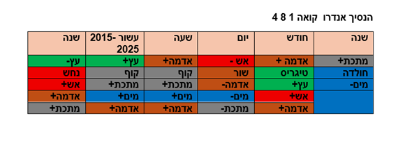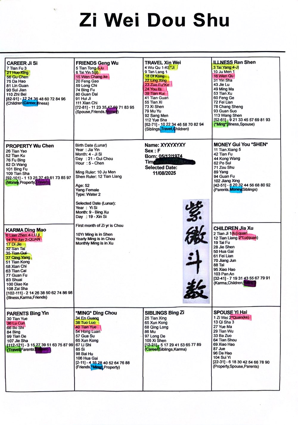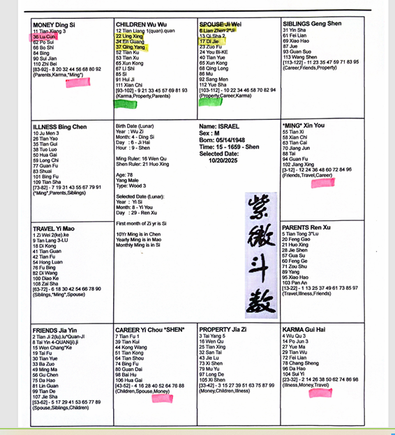 טכניקת ארבעת עמודי הגורל ואסטרונומרולוגיה בנויה על הבנת מסלול כדור הארץ ביחס לשמש. אזי כל חודש מתחיל בתאריך קבוע מראש. למשל חודש החזיר השנה מתחיל ב 7.11 וכך גם בכל שנה, טכניקת אסטרולוגית הכוכב ( הקיסר ) הסגול מבוססת על מולד הירח. החודש מתחיל במולד ירח בהתאם ללוח העברי שהוא ירחי. החודש הנוכחי ארמון הגורל ה MING החודשי נמצא במזל סוס ,למעשה הוא התחיל ב 20.10.25 , וב 20.11.25 ה MING החודשי עובר למזל כבשה. ה MING השנתי נשאר בארנבת עד ה 20.6.26 וה MING העשורי נשאר בדרקון עד ה 22.6.2030. עד ה 20.11.25 ארמון הגורל החודשי של מדינת ישראל נמצא בארמון הסוס עם ה TAG הקבוע של ארמון הזוגיות עם ה TAG העשורי של ארמון ה PROPERTY ( נכסי המדינה , כל האדמות בשליטתה ) וארמון הקריירה השנתי.