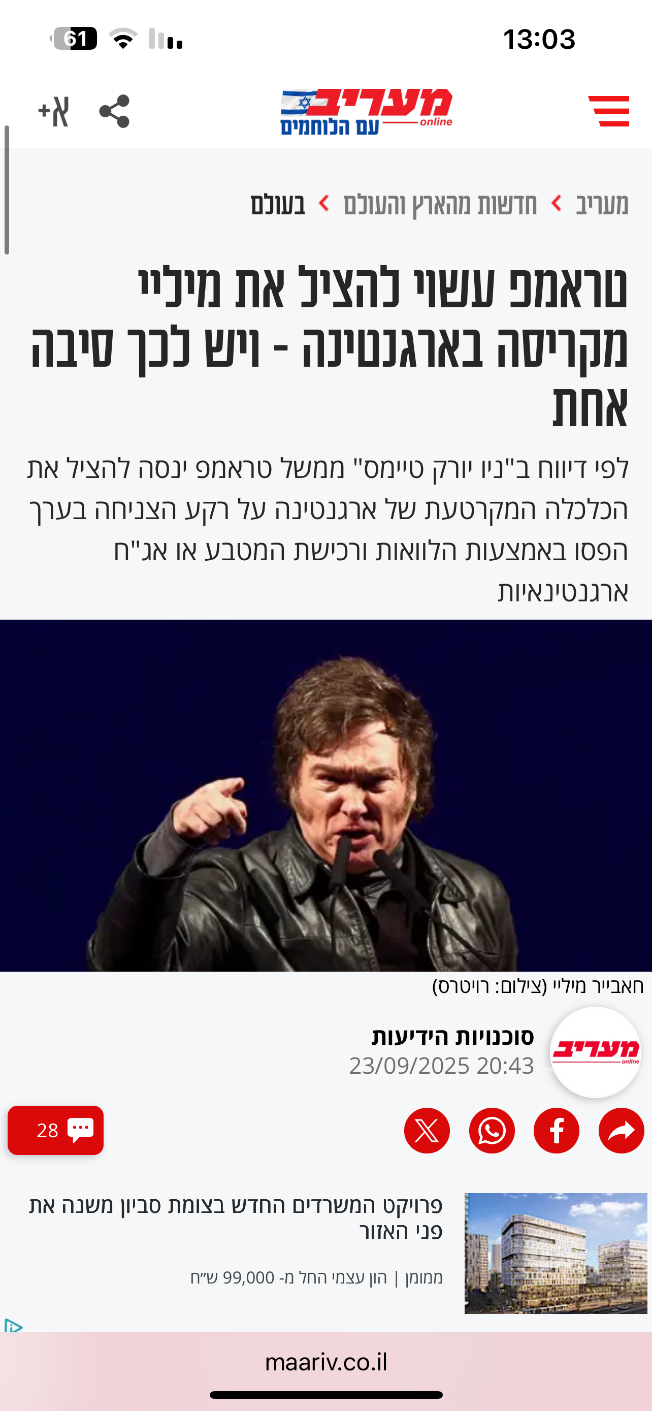 ואכן צודק ערן הילדסהיים. אבל התמונה יותר מורכבת, חבייר מיליי נשיא אערגטינה נכנס לשנת הקארמה שלו ב 4.2.25, לכאורה הכל זרם נפלא, הוא קצר הצלחות ותשואות, רבים ראו בחזון הכלכלי שלו כמודל אידיאלי. אבלך הקאטרמה יותר חזקה ממילים וגם ממעשים. והסתבר שהתמונה מכילה הרבה יותר פרטים ממה שנראה בתחילה. מצבה של ארגטנינה רחוק מלהיות כפי ששיערו. ומי שבא לעזרתו היה הנשיא טראמפ , שמכנה את חבייר מיליי ": הנשיא החביב ביותר עלי ". טראמפ העניק לארגנטינה, ביטחונות בסך 20 מיליארד דולאר. עם הבטחה לסכום דומה בעתיד הקרוב.