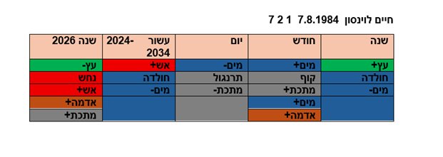 לחיים לוינסון יש מפה חזקה כמותית גם ללא ידיעת שעת הלידה שלו, מרבית המפה שלו בנויה ממתכת ומים שני אלמנטים המציינים עומק, חדות, דיוק וסדר, אבל עודף מים ועוד בשלב 1 מתוך ה 12 מציין גם הסתרה, ומניפולטיביות אבל גם ראשוניות ונאיביות. בפברואר 2025 הוא נכנס לשנה 1 במחזור בין 9 השנים. במחזור ה BAZI הוא נכנס בשנה שעברה לעשור של חולדה אש. המצב הזה מכונה FU YIN . מצב של סטגנציה עם עליות ומורדות. ושנת 2025 היא נקודת הפתיחה וייקח לו לפחות עוד שנה ו 8 חודשים על מנת לחזור לעצמו וגם אז זה יהיה חלקי למדי.