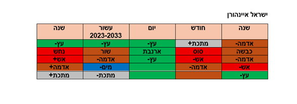 בשנת 2025 ישראל איינהורן נמצא בשנה 6 כמו כל ילידי הקבוצה שלו, אבל ילידי הקבוצה שלו נחלקים ל 9 קטגוריות. הוא אישית נמצא במצב של CLASH עם רשויות, גופים, תאגידים. ובשנה הבאה הוא ימצא בשנה 7 של סיומות לטוב ולרע, אבל בתוך שנה 7 הוא יהיה במיקום של שנת הקארמה. אין זה דומה לשנת הקארמה עצמה שהיא השנה ה5 למחזור, אלא מדובר בשנה של סיומות עם ניחוח של אירוע קארמתי שנועד להיות, על מנת לסגור מעגל. וזאת רק ההתחלה, מכיוון שבשנת 2023 הוא נכנס לעשור של שערי גיהינום, ולא רק זאת, העשור הזה יוצר CLASH חזק לשנת הלידה שלו ( כבשה אדמה ).