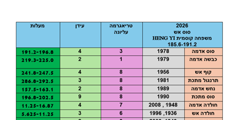 כל המידע הנחוץ בפנג שואי ( תיקונים, חיזוקים והפעלות ) 13 עמודים כולל טבלאות של פנג שואי חודשי, כולל טבלאות של זמן מרחב, המחברות בין מעלות חזית המבנה הנבדק לשנת 2026